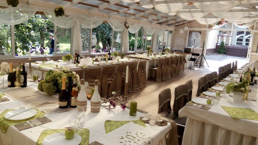 Отдельно стоит выделить в усадьбе Заречаны стиль рустик с его нарочитой простотой и элегантностью. Композиции из полевых цветов, аксессуары на основе природных и подручных материалов: мха, сухоцветов, обычных банок, деревянных спилов – вот главные тенденции, касающиеся оформления свадеб 2020 в стиле рустик.
