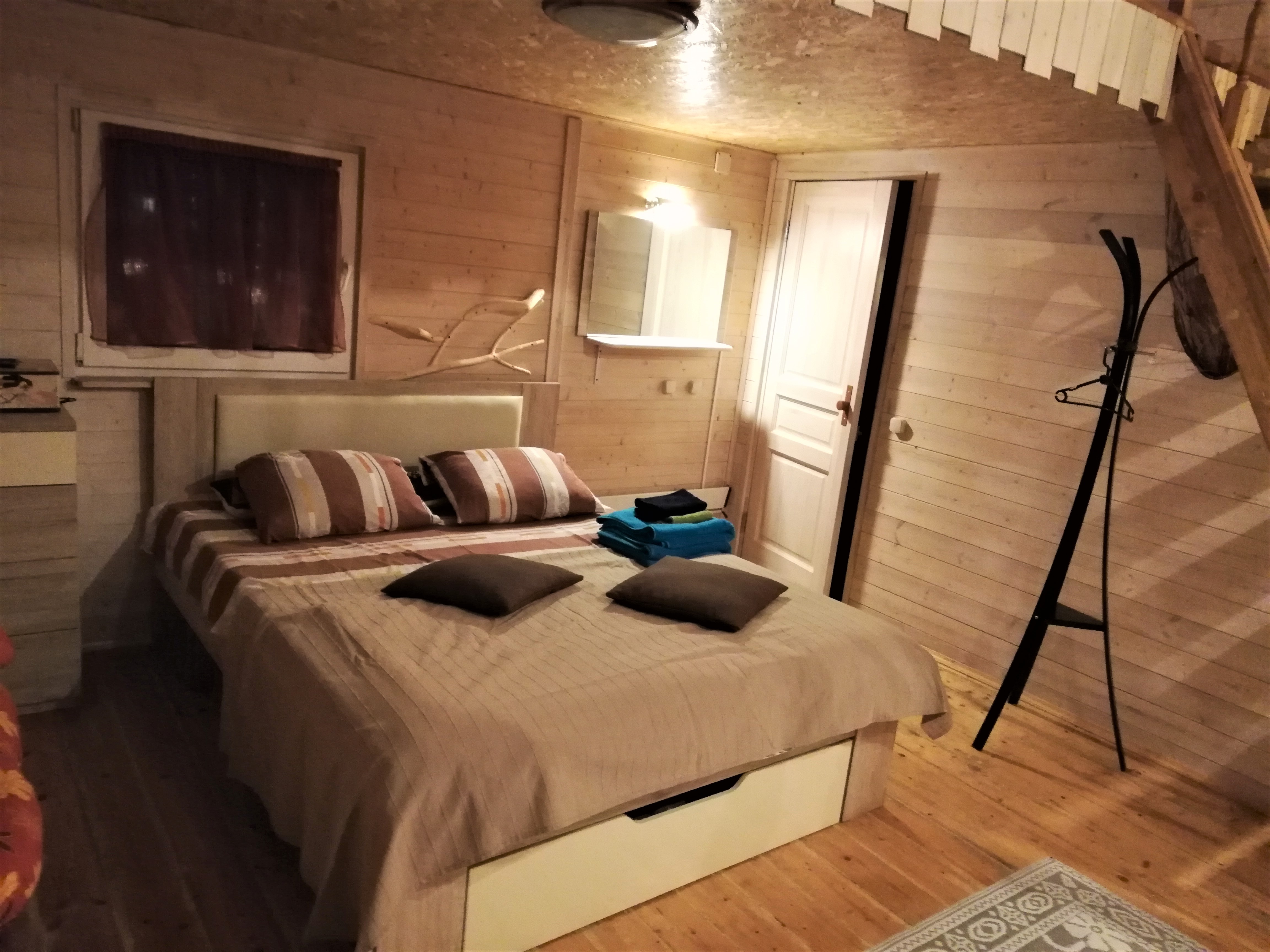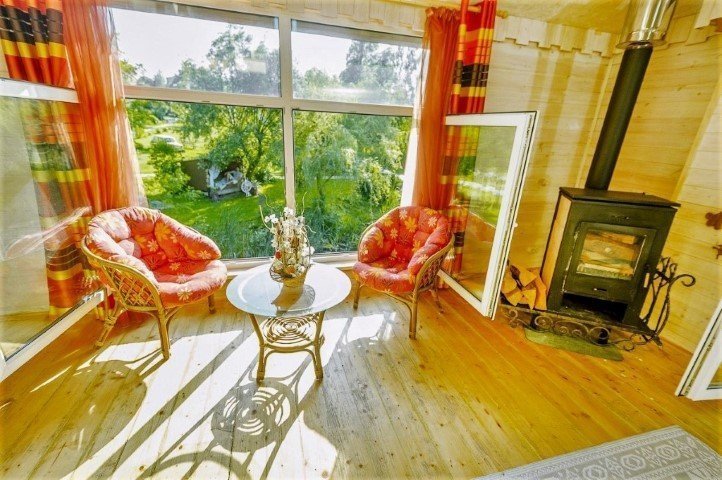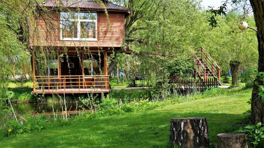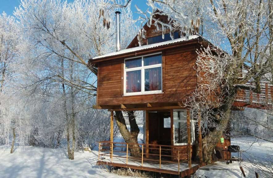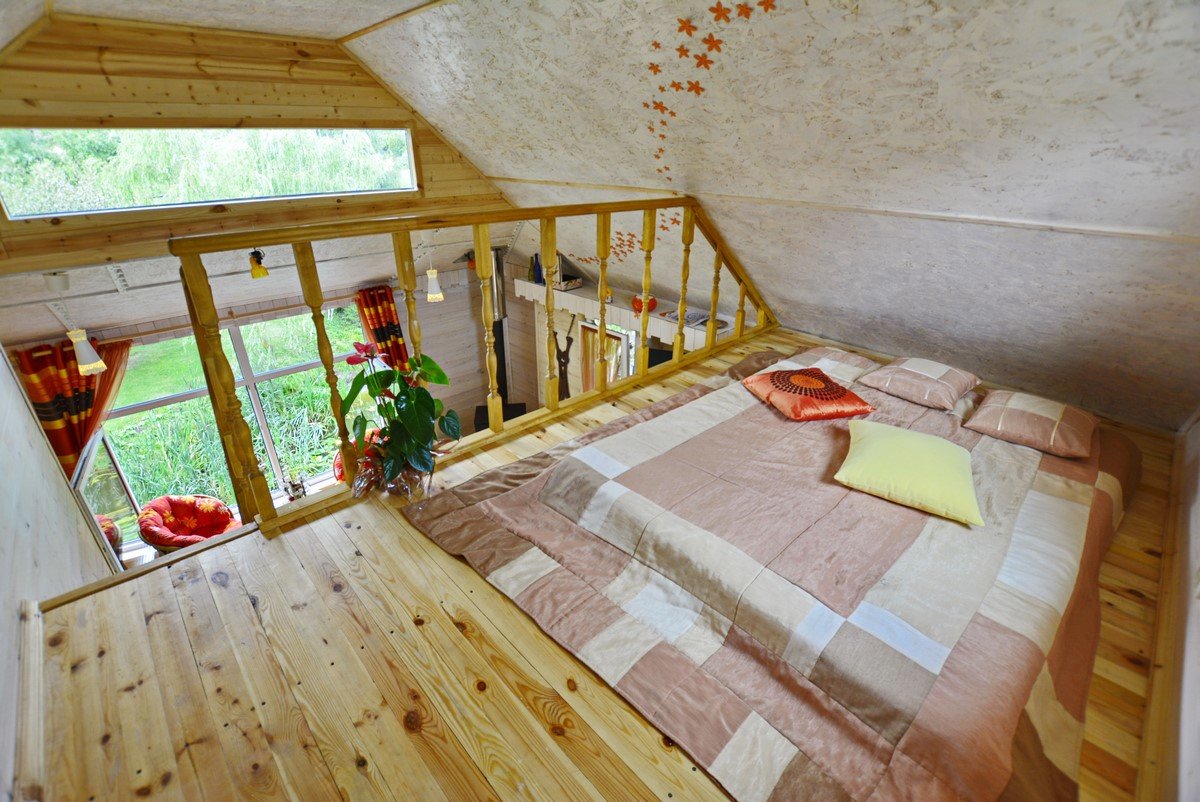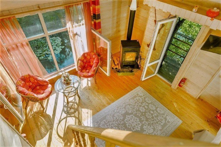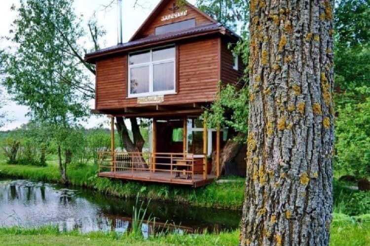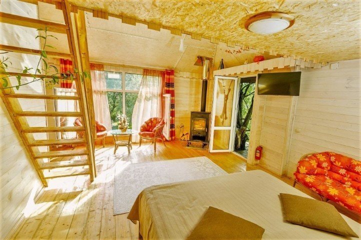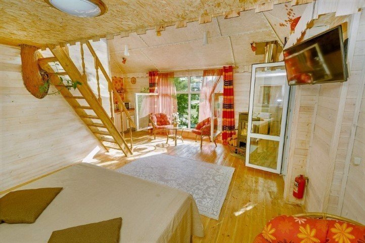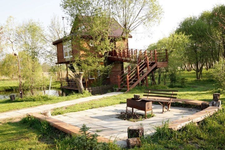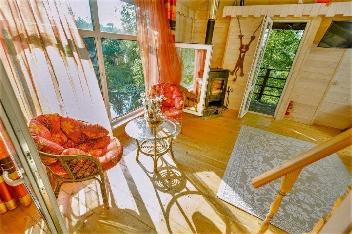 Домик «парит» на берегу небольшого пруда — любоваться видами можно с одного из 2 балконов. Внутрь ведет широкая деревянная лестница с перилами. Стены и крыша утеплены, есть печь-камин на дровах, выполнена звукоизоляция от дождя. При всей нестандартности деревянного строения, размеры его весьма внушительные — 36 «квадратов». Внутренняя обстановка напоминает квартиру- студию: из небольшой прихожей попадаешь в просторную комнату с компактной кухонной зоной. Можно гулять по всей территории усадьбы и за ее пределами, а также пользоваться платными услугами. Например, сходить в баню или сауну, покататься на квадроцикле, поиграть в пейнтбол или лазертаг. А еще здесь кормят вкусными натуральными продуктами. Вам понадобится меньше часа, чтобы забыть о повседневных заботах и оказаться в тишине и покое чудесного уголка природы. Свежий воздух, соловьиные трели, еловый лес и пруд с розовыми лилиями…