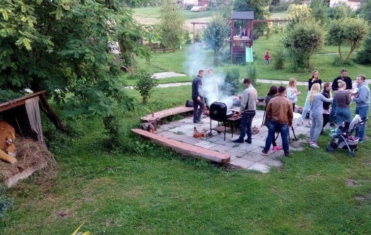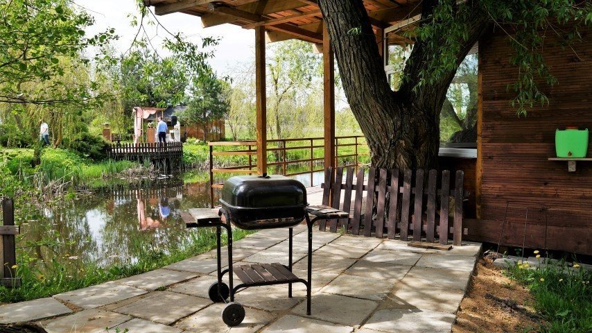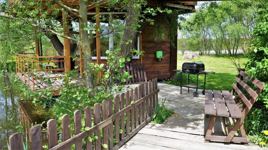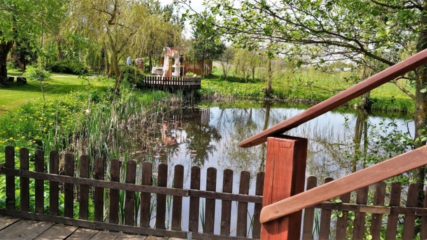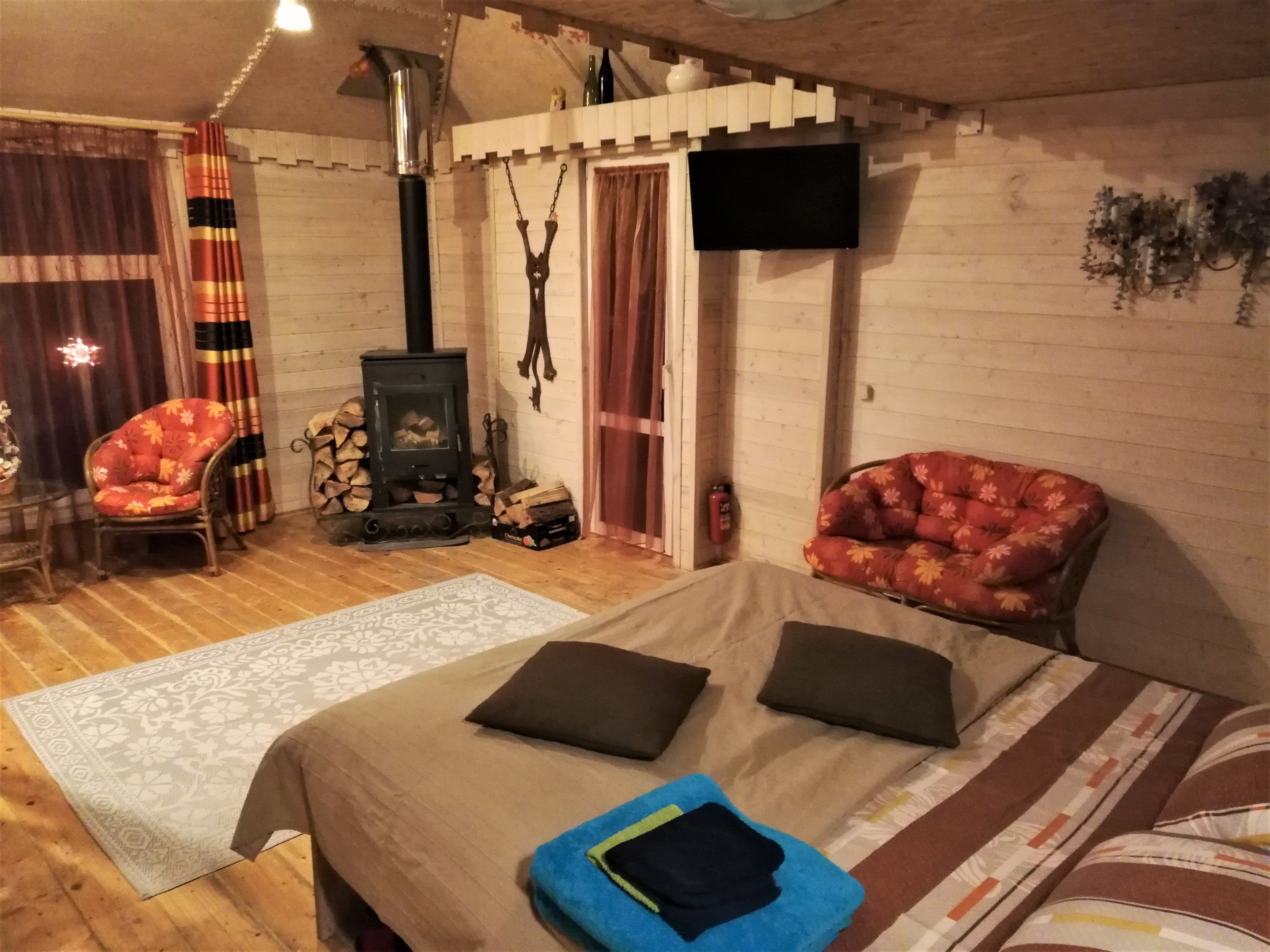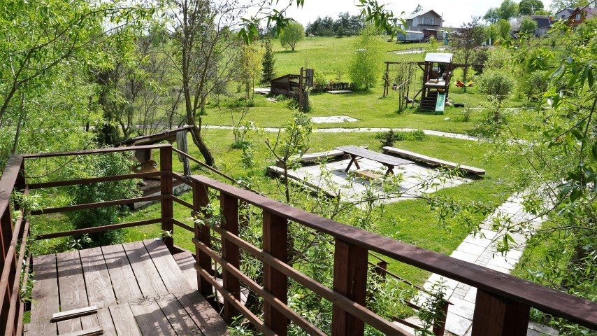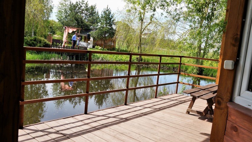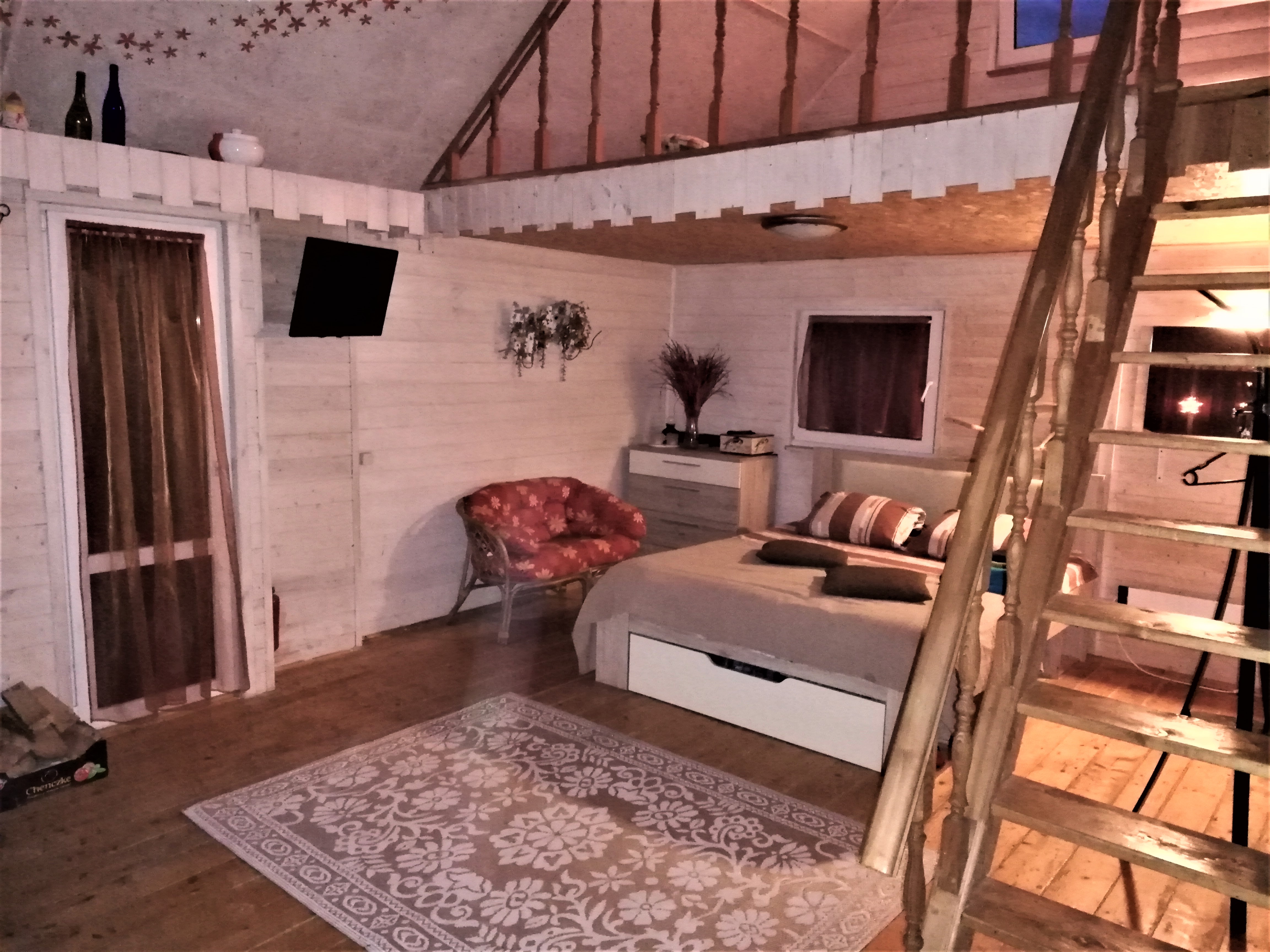 Домик «парит» на берегу небольшого пруда — любоваться видами можно с одного из 2 балконов. Внутрь ведет широкая деревянная лестница с перилами. Стены и крыша утеплены, есть печь-камин на дровах, выполнена звукоизоляция от дождя. При всей нестандартности деревянного строения, размеры его весьма внушительные — 36 «квадратов». Внутренняя обстановка напоминает квартиру- студию: из небольшой прихожей попадаешь в просторную комнату с компактной кухонной зоной. Можно гулять по всей территории усадьбы и за ее пределами, а также пользоваться платными услугами. Например, сходить в баню или сауну, покататься на квадроцикле, поиграть в пейнтбол или лазертаг. А еще здесь кормят вкусными натуральными продуктами. Вам понадобится меньше часа, чтобы забыть о повседневных заботах и оказаться в тишине и покое чудесного уголка природы. Свежий воздух, соловьиные трели, еловый лес и пруд с розовыми лилиями…